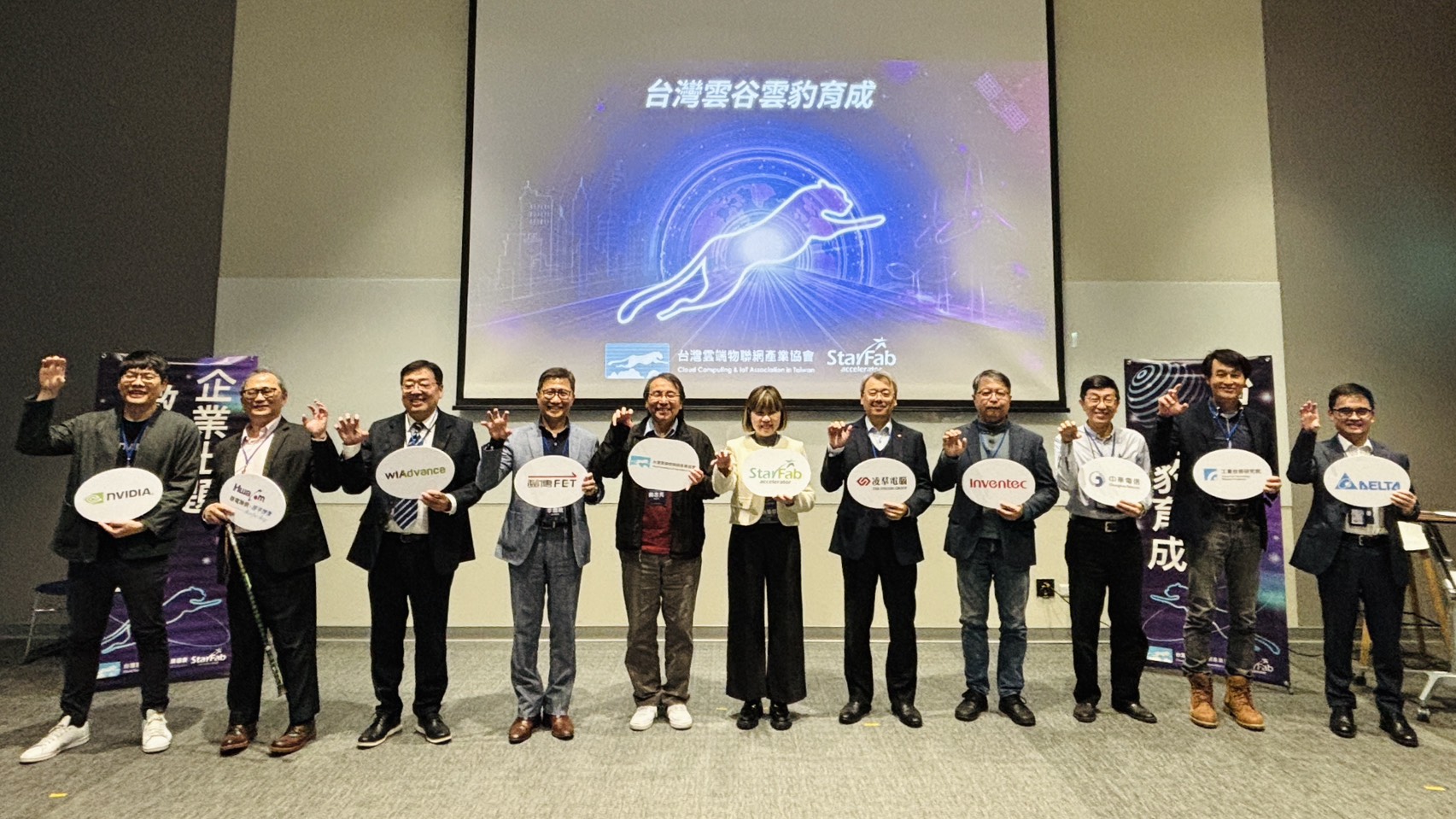 台灣雲端物聯網產業協會秘書長闕志克、StarFab董事長劉晏蓉與第13屆雲豹育成企業導師代表一一