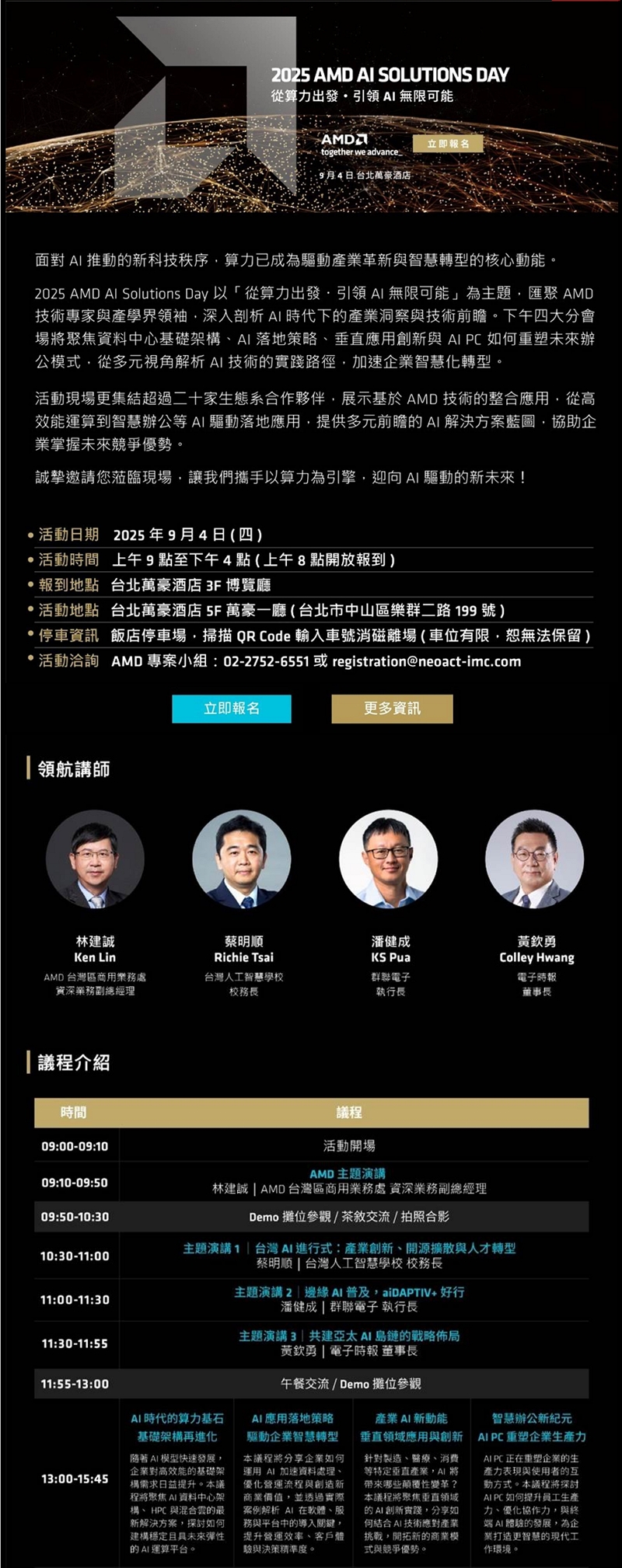 誠摯邀請您參加 2025 AMD AI Solutions Day,與來自產業、學界與技術領域的領袖共聚一堂,深入交流 AI 發展趨勢與應用實踐。今年活動以「從算力出發・引領 AI 無限可能」為題,活動將聚焦於 AMD AI 發展趨勢與最新產品佈局,並結合來自產學界與業界的重量級講者觀點,共同探索 AI 驅動下的產業變革與技術前瞻。
