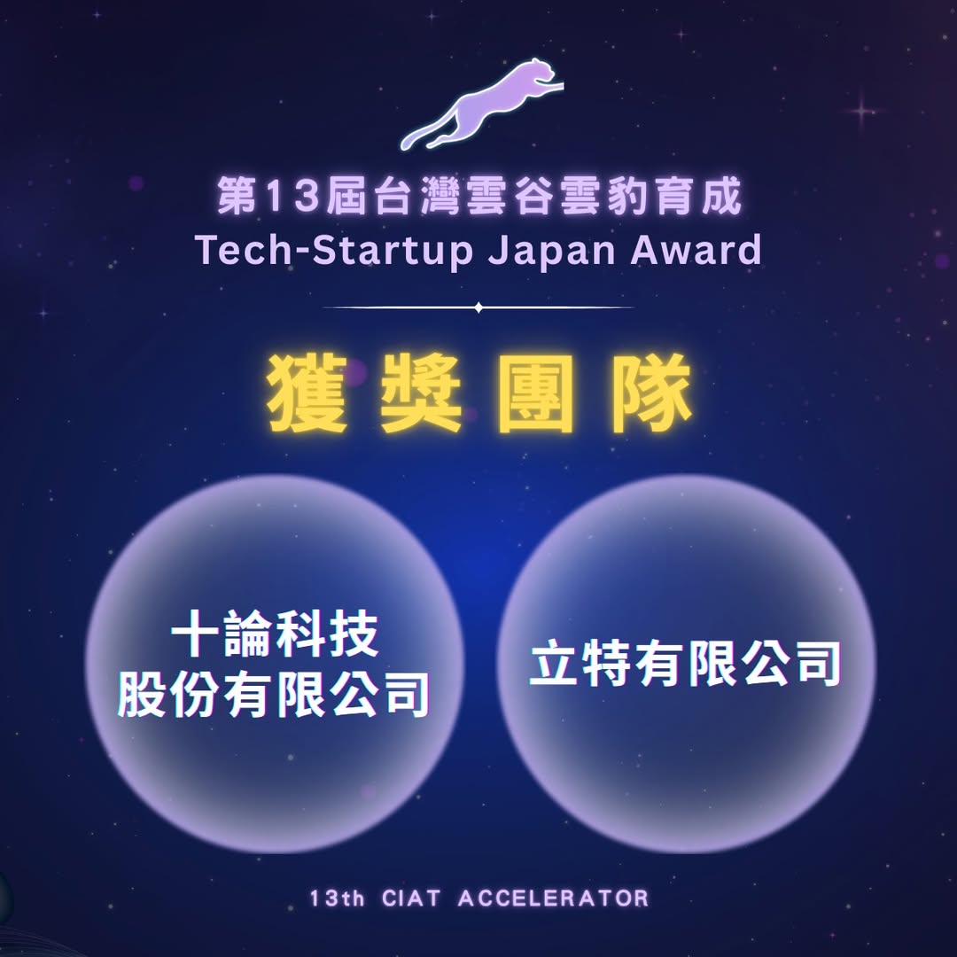 本屆評選特別邀請台灣雲協執行秘書暨工研院總監徐銘宏、凌羣電腦總處長邱坤廷,及雲豹育成執行單位StarFab董事長劉晏蓉擔任評審團,針對團隊的產品技術、商業模式、業務拓展計畫與日本市場布局潛力等面向進行審查,最終由 「十論科技股份有限公司」與「立特有限公司」 兩家新創脫穎而出,榮獲本屆 Tech-Startup Japan Award 殊榮。