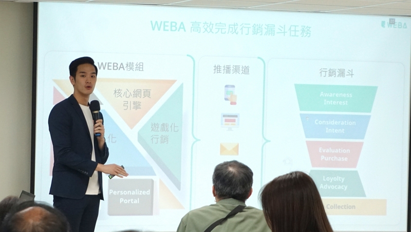在數位行銷競爭激烈的時代,WEBA客戶經理林暐中分享如何以AI驅動的No-code平台,協助企業快速打造個人化行銷頁面並精準觸達客群。他說明,WEBA不僅能一站式完成網站生成、上架與內容製作,更能整合多渠道(官網、社群、EDM、LINE等),針對不同客群推出專屬行銷內容。