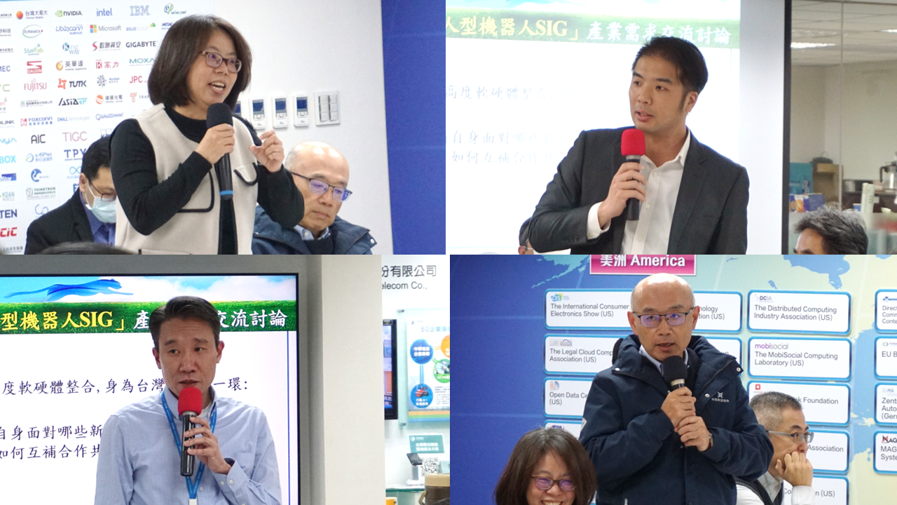 機器人產業供給與需求雙方與會先進對雲協籌組「人型機器人SIG」提供建言 (左上:智動協會 朱盈勳副秘書長;左下: 中保科技 鄧經忠總經理; 右上: 新漢創博 羅仕昀協理; 右下:中華電信研究院 汪世昌所長) 一一