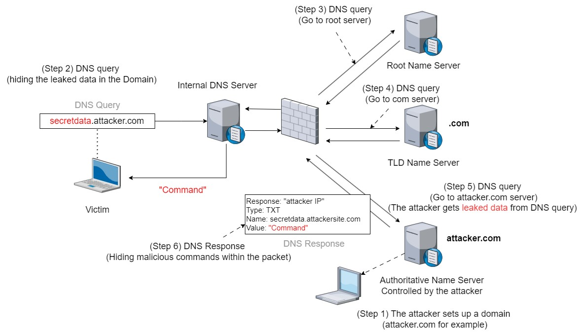 DNS隧道通過惡意程式利用DNS 請求和DNS 回覆的流程用來達到和外網通訊。假設攻擊者已經將惡意程式成功的在內網的主機內被執行,並且想要建立與其之間隱蔽的連線方式,用來取得內部資料,其詳細流程如圖1。根據圖1攻擊者先設定一個網域,例如"attacker.com"。攻擊者在自己控制的DNS伺服器上設定"attacker.com"的解析記錄,將該網域指向攻擊者的IP地址(步驟 1)。內網的惡意程式在目標系統上運行,並準備透過DNS隧道與攻擊者的DNS伺服器進行通信。惡意程式中的數據要傳送給攻擊者,並且將數據藏在FQDN中。在內網的惡意程式會發起DNS請求例如{secretdata}.attacker.com,其中{secretdata}是要傳送的數據。但由於內網的DNS Server無法找尋到相關紀錄,只能轉發到外網去尋找(步驟2)。DNS 請求轉發到外網後,按照DNS解析的流程由後往前解析FQDN(Fully Qualified Domain Name),先從Root Server、TLD Server最後會轉發到攻擊者事前所架設好的主機,攻擊者成功獲取到藏在FQDN裡面的{secretdata}(步驟3、4和5)。攻擊者獲取到DNS請求內所包含的洩漏資料,而攻擊者同樣的也是將指令封裝成DNS回覆封包回傳給內網的惡意程式(步驟6)。