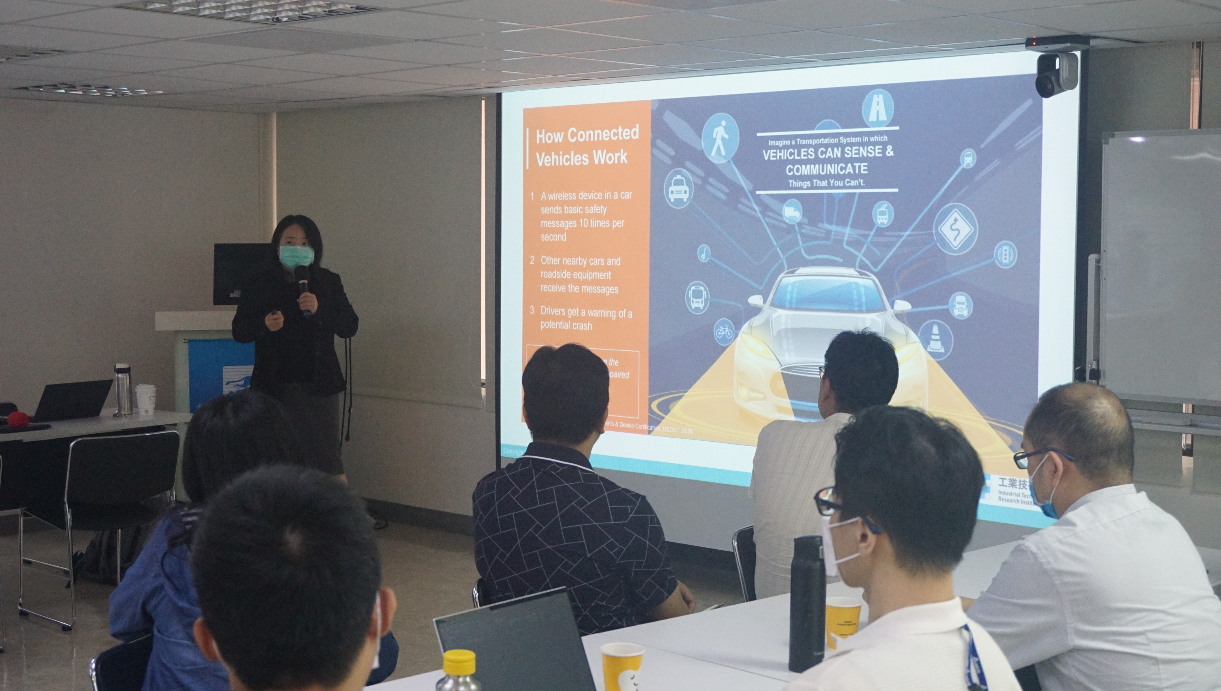 第一個議程首先由台灣雲協無人載具SIG曾蕙如經理,分享V2X車聯網通訊技術、感測器與深度學習影像的技術特性及應用於道路交通安全上的案例。目前在全台灣,經濟部已核准13案自駕車上路實驗,曾經理執行的專案也有針對公車、緊急車輛及輕軌,設置安全警示系統及車機,預防路口人車碰撞。會中還提及運用影像感知融合技術,提升夜間車輛辨識精確度之應用。期待相關技術之應用,可降低交通事故發生機率,也帶動相關技術及產業之發展。