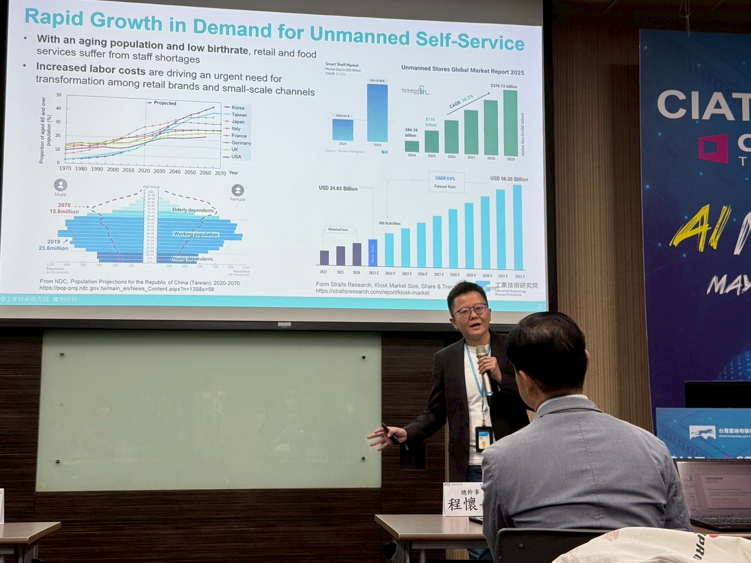 工研院資通所組長王恩慈在「智慧零售進化論:無人化自動營運的革新應用」主題下,分享國內外無人商店應用現況。她指出,面對少子化與勞力短缺趨勢,零售場域正逐步走向無人化營運,雖然疫情前無人商店經營困難,但近期歐美與立陶宛等地,無人店鋪應用逐漸復甦,技術也日益成熟。 透過VLM技術與AIoT智慧貨架整合,零售場域可實現「Grab&Go」無人購物流程,從顧客進店、取貨、結帳到離店全程自動化。另藉由Camera安裝於Kiosk點餐機,能即時偵測操作困難,並搭配GUI與個人化推薦提升顧客體驗。後台則透過智慧庫存管理與BI報表,隨時掌握商品與人流狀態,優化營運決策。未來,團隊將持續開發模組化智慧貨櫃屋,應用於快閃店、Food Bank等多元場域,擴展無人化商業場景。