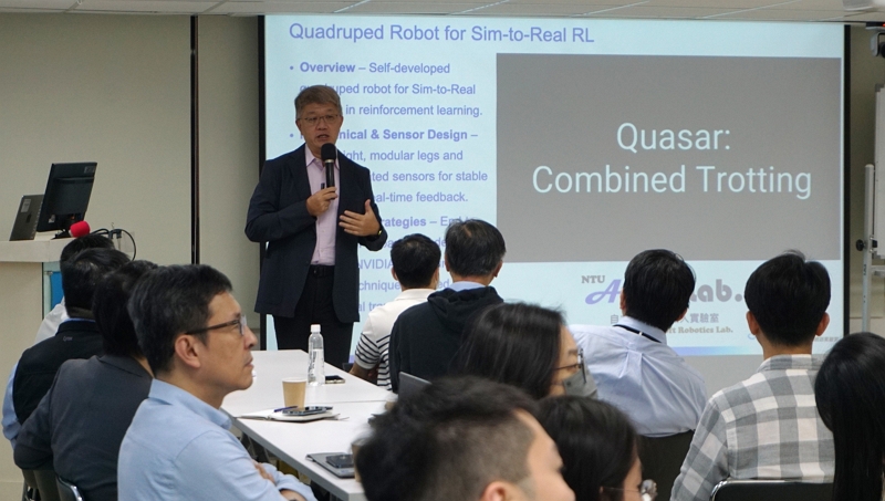 因此,所謂「具身智慧(Embodied AI)」不是抽象名詞,而是讓 AI 真正取得行動能力的技術核心。施主任展示台大人工智慧與機器人研究中心多年耕耘的成果:模組化足球機器人、可替換機構的關節、模擬世界先學習再部署到實體機器人的訓練流程,以及「倒一杯水」這個看似平凡卻包含重量感測、液體流動預測與手眼協同的高難度任務。