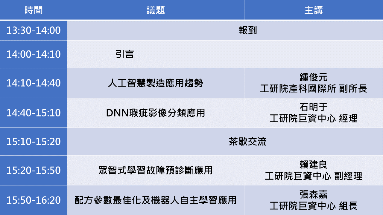 為協助協會會員及人工智慧(AI) SIG廠商掌握智慧製造領域趨勢、相關技術及台灣應用落地實例,台灣雲協技術專家委員會特別取材工研院巨資中心今年3/14舉辦之「AI大未來:應用與技術交流會」活動,邀請工研院產科國際所專家,分享國、內外智慧製造應用趨勢;並由工研院巨資中心專家,分別以「DNN瑕疵影像分類應用」、「眾智式學習故障預診斷應用」、「配方參數最佳化及機器人自主學習應用」為題,介紹如何將深度神經網路(Deep Neural Networks, DNN)、眾智式學習(Ensemble Learning)、深度增強式學習(DRL)等人工智慧(AI)技術落實於產線,實際降低維護成本、提升生產效率、因應彈性生產,達成智慧製造之落地應用。