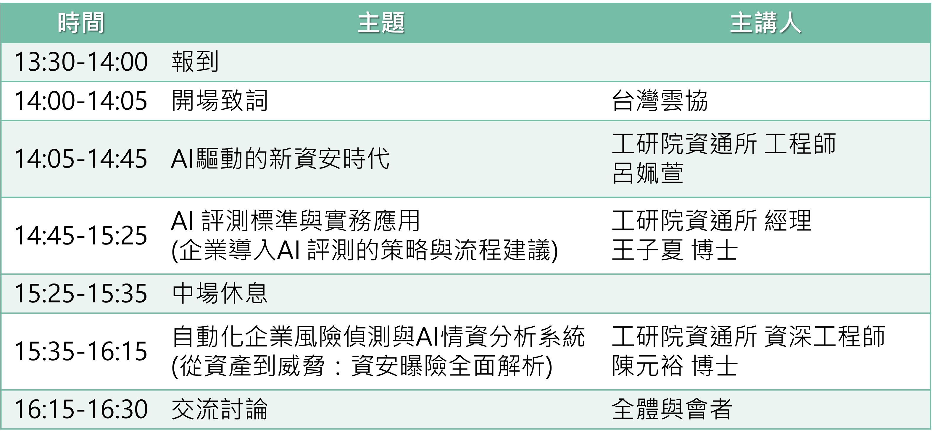 面對AI技術在企業與政府單位的快速導入,資安防護也進入轉型關鍵期。從ChatGPT到各類生成模型的普及,AI帶來效率與洞察,同時也開啟了全新的攻擊面、模型風險與資料洩漏挑戰。本次研討會將攜手工研院資安、AI和政策領域專家,深入剖析AI如何重新定義企業資安戰略,打造從偵測到應變一條龍的智慧資安防線,掌握真正「可落地」的解決方案與趨勢。會中將針對AI評測標準與實務應用及自動化曝險偵測:AI 驅動的資安防線兩大議題分享,歡迎廠商踴躍報名參加。